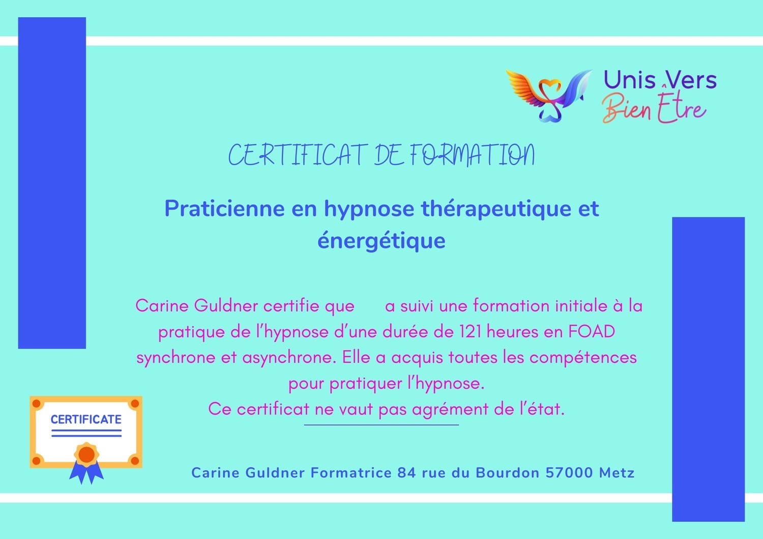 Au sein d’Unis Vers Bien Être, Carine Guldner forme les praticiens et les particuliers à une hypnose thérapeutique complète et intégrative, qui relie la science, la conscience des schémas inconscient. Car sans conscience rien ne transmute.